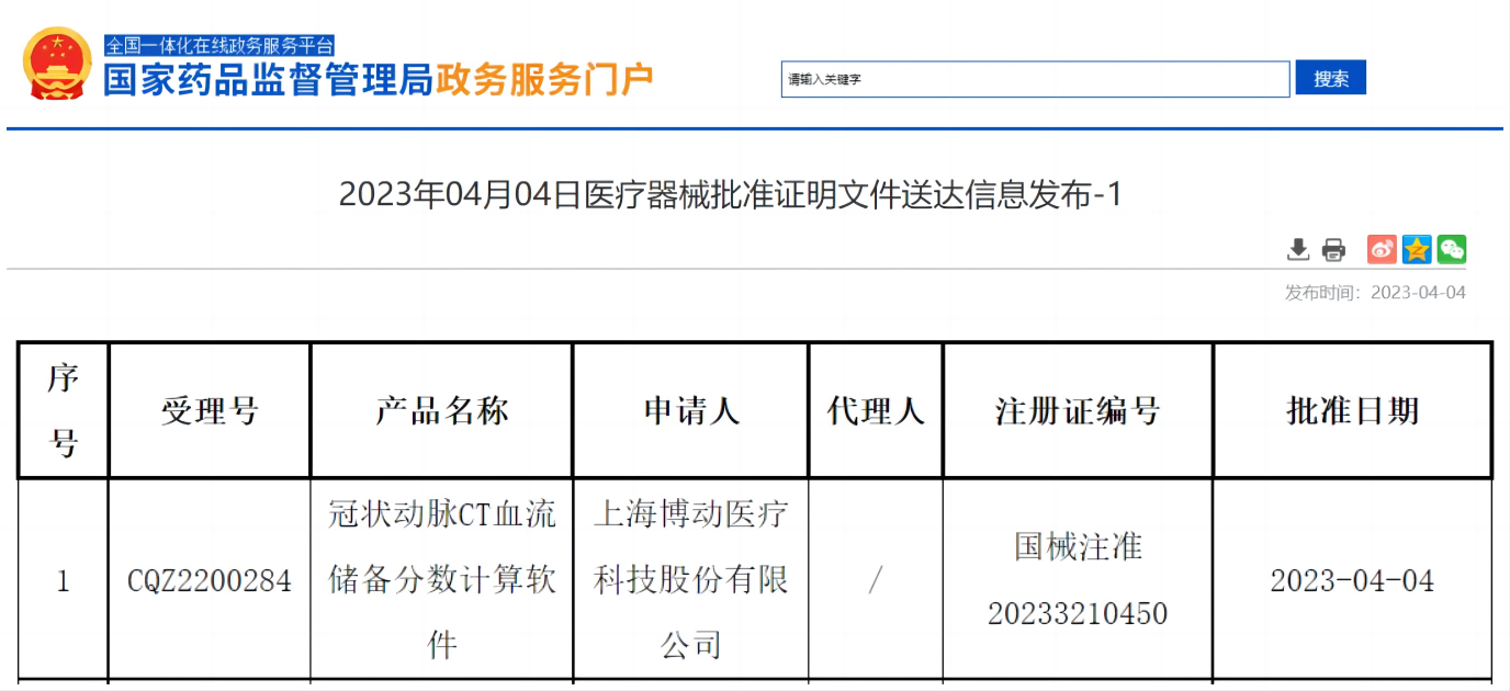 2023年4月4日,經(jīng)國(guó)家藥監(jiān)局NMPA公示,上海博動(dòng)醫(yī)療科技股份有限公司的創(chuàng)新醫(yī)療器械“冠狀動(dòng)脈CT血流儲(chǔ)備分?jǐn)?shù)計(jì)算軟件”(國(guó)械注準(zhǔn)20233210450)獲得國(guó)家藥品監(jiān)督管理局批準(zhǔn)上市,奧泰康承擔(dān)本項(xiàng)目臨床試驗(yàn)服務(wù),系2023年奧泰康助力獲得的第六張三類醫(yī)療器械注冊(cè)證。