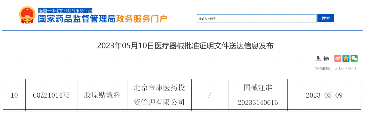 2023年5月9日,奧泰康北京CDMO中心取得「首張」國家藥監(jiān)局批準(zhǔn)的三類醫(yī)療器械注冊證(國械注準(zhǔn)20233140615),系全國首個以細(xì)胞外基質(zhì)來源的膠原蛋白為原料制備的三類膠原貼敷料。此項目是北京CDMO中心基于“十三五”國家重點(diǎn)研發(fā)計劃項目,在MAH制度下,與湖北恒安芙林藥業(yè)股份有限公司戰(zhàn)略合作完成涵蓋市場準(zhǔn)入全流程業(yè)務(wù)的醫(yī)美類項目,也是器械CRO/CDMO行業(yè)受托研發(fā)誕生的全國首個三類醫(yī)療器械注冊證,具有里程碑意義。