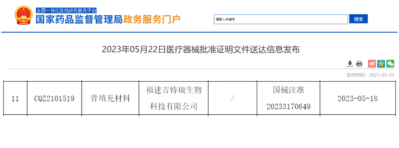 「MA成果發(fā)布」福建吉特瑞·骨填充材料獲證——2023年「第9張」三類醫(yī)療器械注冊證???