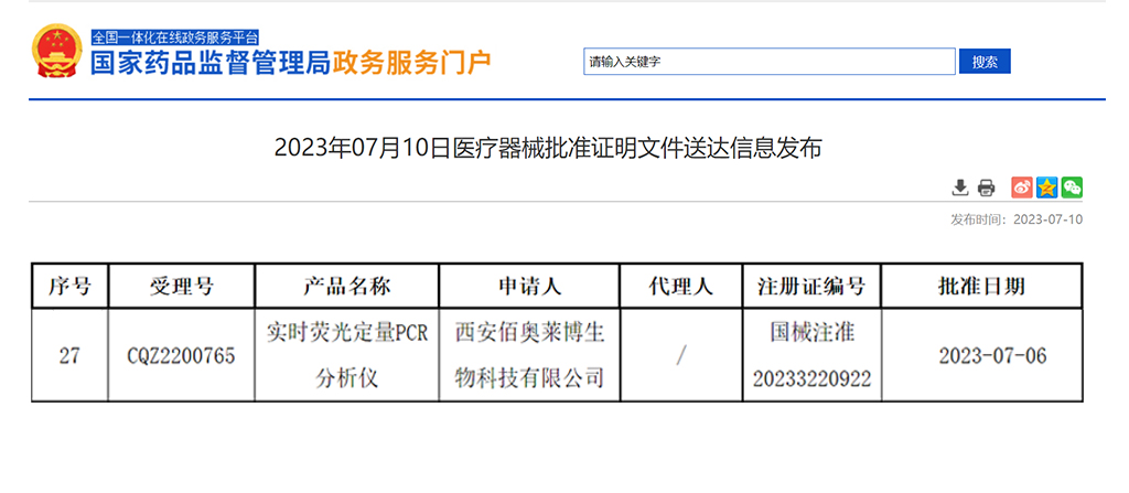 2023年7月6日,經(jīng)國(guó)家藥品監(jiān)督管理局公示,西安佰奧萊博生物科技有限公司的“實(shí)時(shí)熒光定量PCR分析儀”(國(guó)械注準(zhǔn)20233220922)獲得NMPA批準(zhǔn)上市,系2023年奧泰康助力獲得的第11張三類醫(yī)療器械注冊(cè)證。