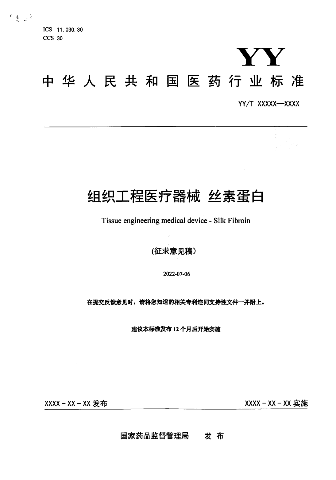 隨著絲素蛋白醫(yī)療器械產品的增加,對這一材料的生產制備、質量控制等提出了要求。相對于產業(yè)的迅速發(fā)展,絲素蛋白相關標準在國際國內仍處于空白。由于標準的缺乏,各絲素蛋白企業(yè)在企業(yè)標準制定過程中無統(tǒng)一的標準參考依據,限制了絲素蛋白醫(yī)療產業(yè)的高質量發(fā)展。目前,為提高絲素蛋白材料的質量與安全性,為科學監(jiān)管提供支撐,由全國外科植入物和矯形器械標準化技術委員會組織工程醫(yī)療器械產品分技術委員會歸口的《組織工程醫(yī)療器械絲素蛋白》已形成征求意見稿[5],并于2022年8月23日-2022年10月24日期間公開征求意見。
