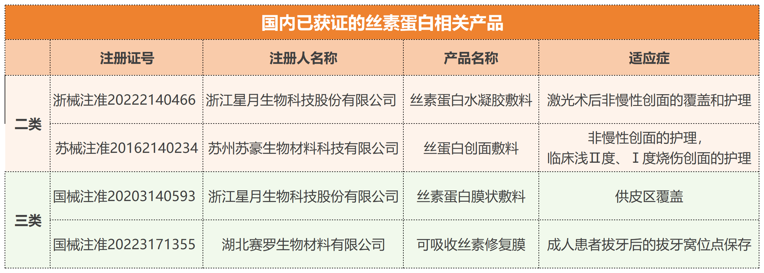 市面已對絲素蛋白制備的做了廣泛探究,目前成功商業(yè)化的產品不多(蠶絲縫合線、SERI外科支架、絲蛋白創(chuàng)面敷料、可吸收手術修復膜、Silk Voice®注射劑等),目前國內共四款絲素蛋白產品獲批,其中僅一款為可吸收產品,說明市場仍具有巨大發(fā)展?jié)摿Α?/em>