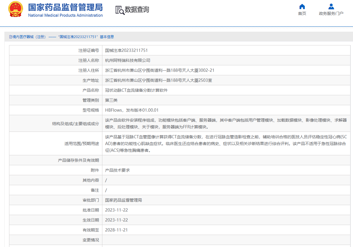 2023年11月22日,經(jīng)國(guó)家藥品監(jiān)督管理局公示,杭州阿特瑞科技有限公司研發(fā)的冠狀動(dòng)脈CT血流儲(chǔ)備分?jǐn)?shù)計(jì)算軟件(國(guó)械注準(zhǔn)20233211751)獲得NMPA批準(zhǔn)上市,奧泰康承擔(dān)本項(xiàng)目注冊(cè)申報(bào)服務(wù),系2023年奧泰康助力獲得的第17張三類醫(yī)療器械注冊(cè)證。