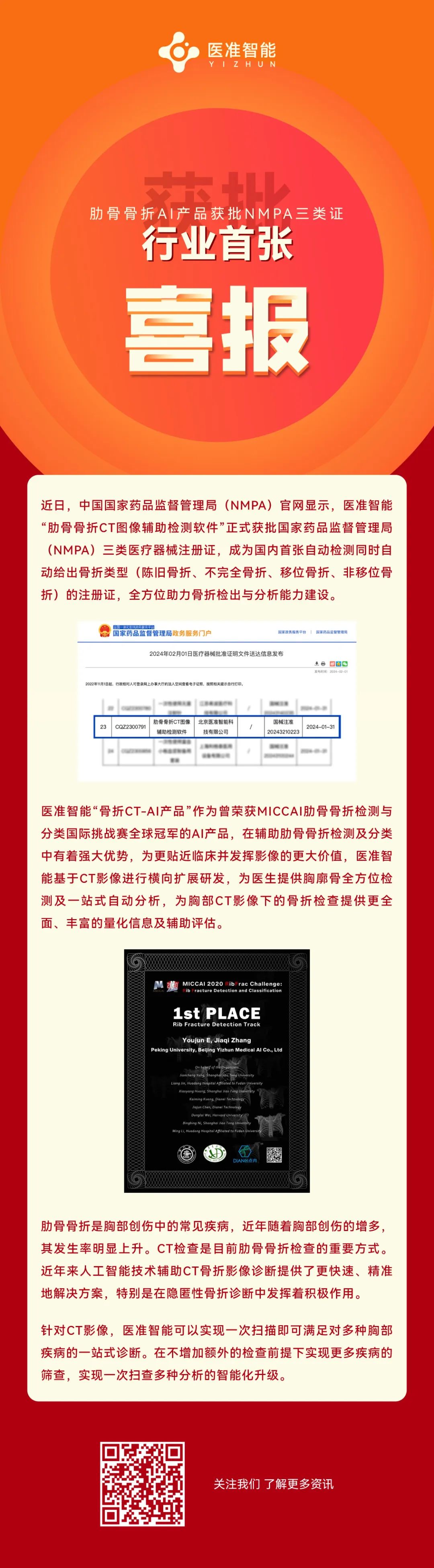 2024年1月31日,經國家藥品監(jiān)督管理局公示,北京醫(yī)準智能科技有限公司的肋骨骨折CT圖像輔助檢測軟件(國械注準20243210223)獲得NMPA批準上市,奧泰康承擔本項目部分臨床試驗工作,系2024年奧泰康助力獲得的第二張三類醫(yī)療器械注冊證。