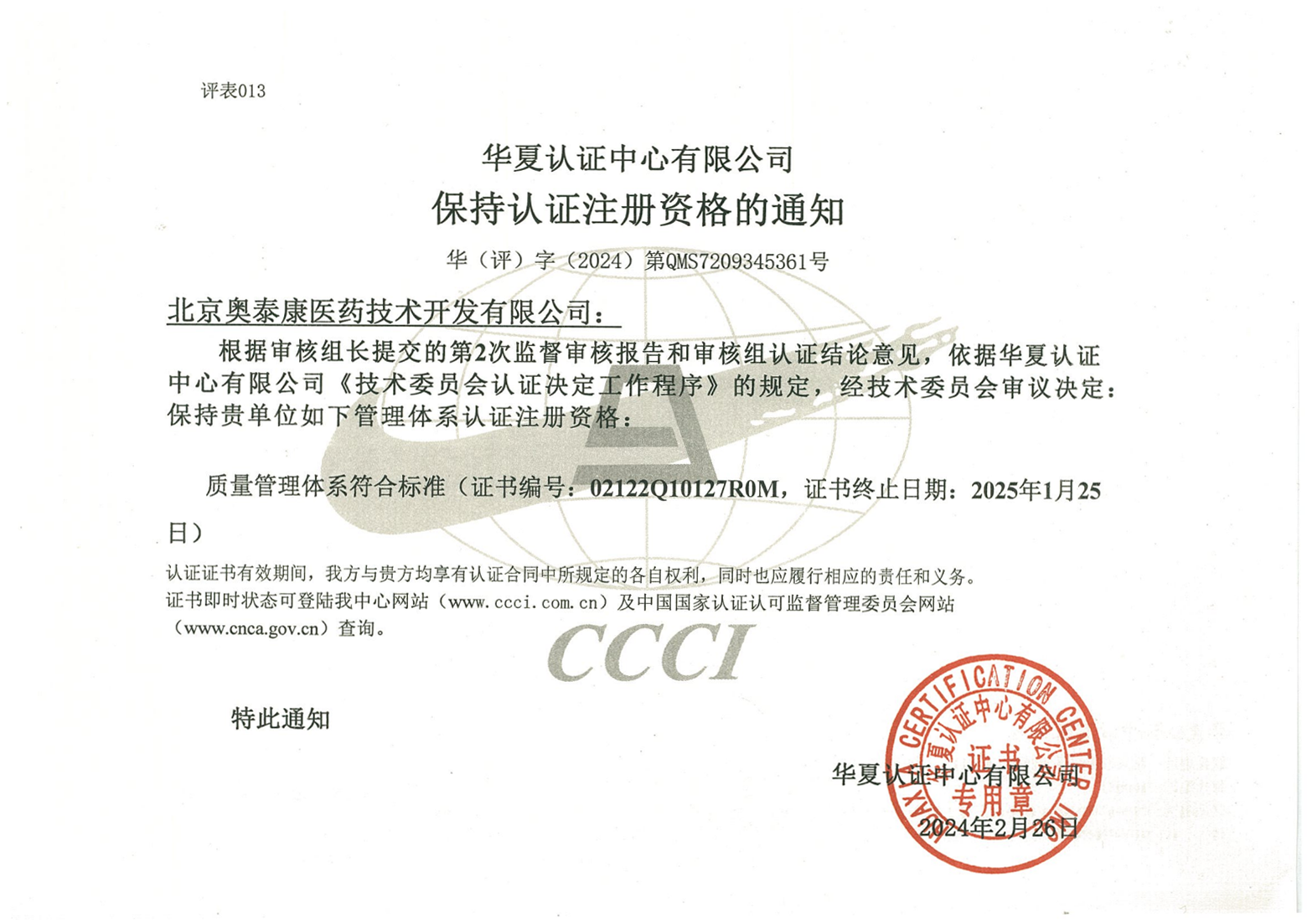 近日,北京奧泰康醫(yī)藥技術開發(fā)有限公司經(jīng)華夏認證中心有限公司(CCCI)認證,順利通過ISO9001:2015 標準質量管理體系認證年度審核,認證范圍為醫(yī)療器械臨床試驗及產(chǎn)品注冊服務。