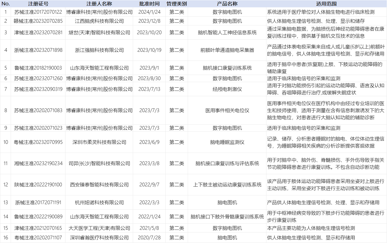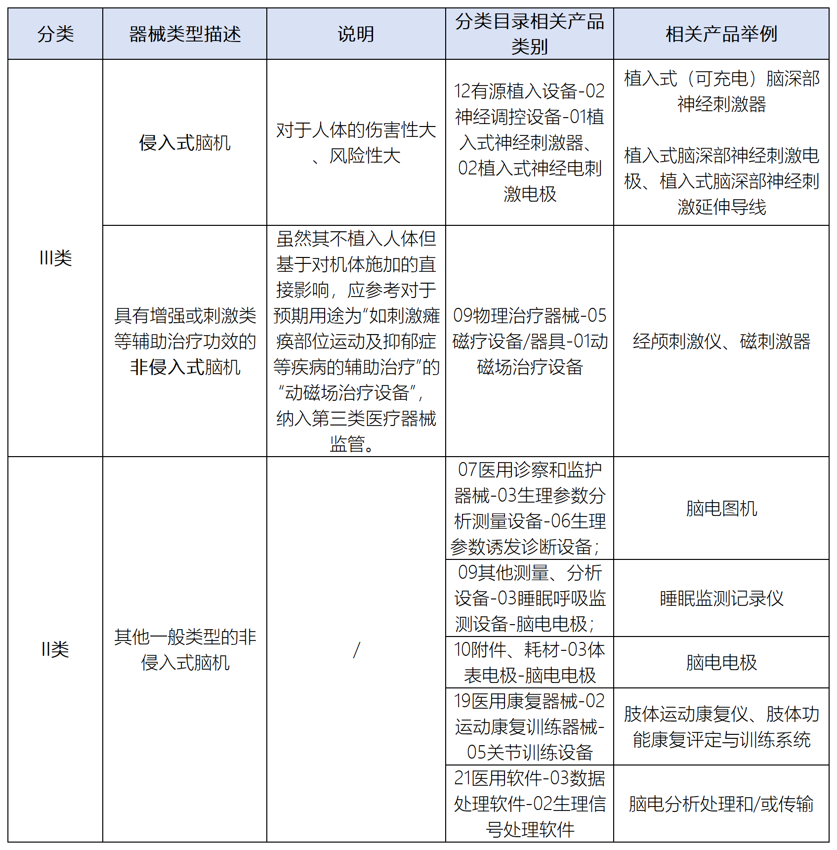 中國器審發(fā)布的《腦機接口的監(jiān)管現(xiàn)狀》指出,由于III類醫(yī)療器械在注冊難度、監(jiān)管要求、申請受理部門層級和申請時長等方面都遠高于II類醫(yī)療器械,我國腦機企業(yè)目前大多選擇非侵入式采集技術(shù)路線。對于侵入式腦機設備,目前都處在臨床性研究和動物實驗階段。目前暫無公開性的由國家藥品監(jiān)督管理局正式批準進入人體臨床試驗階段的侵入式腦機器械。根據(jù)廣義BCI的定義,結(jié)合我國現(xiàn)行《醫(yī)療器械分類目錄》的規(guī)定,與BCI相關(guān)設備的分類主要為II類和III類: