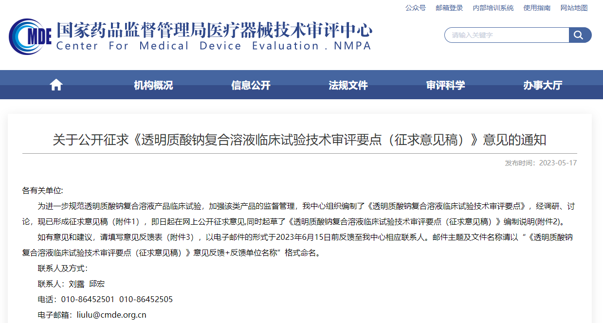 ▲ 《透明質酸鈉復合溶液臨床試驗技術審評要點(征求意見稿)》 (來源:器審中心)