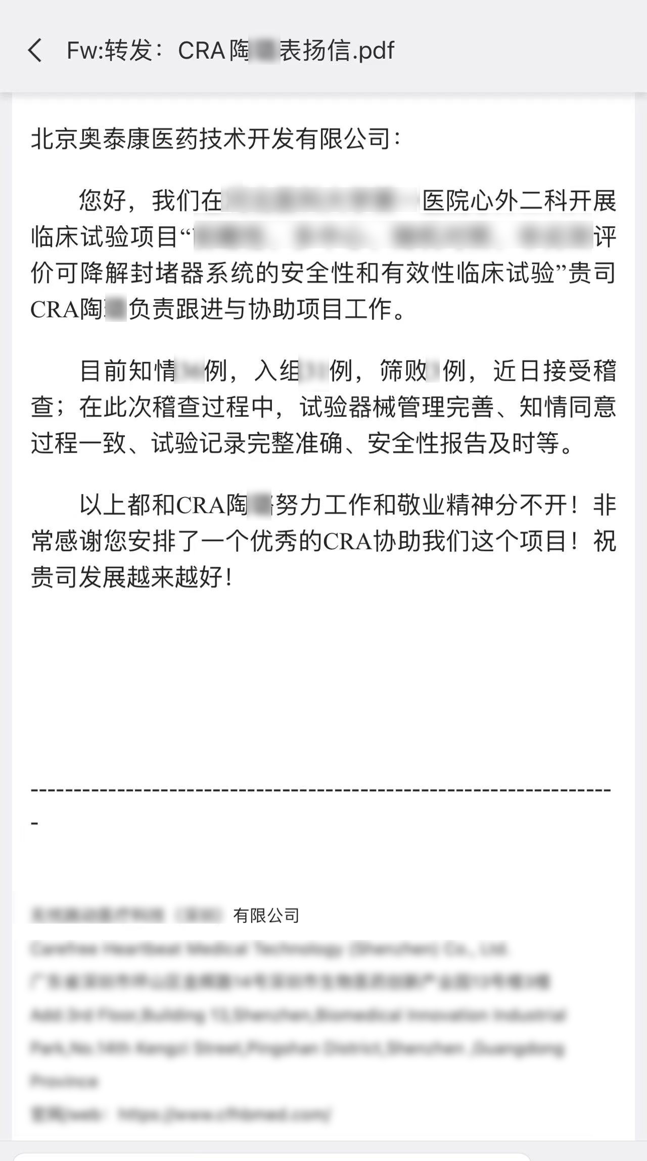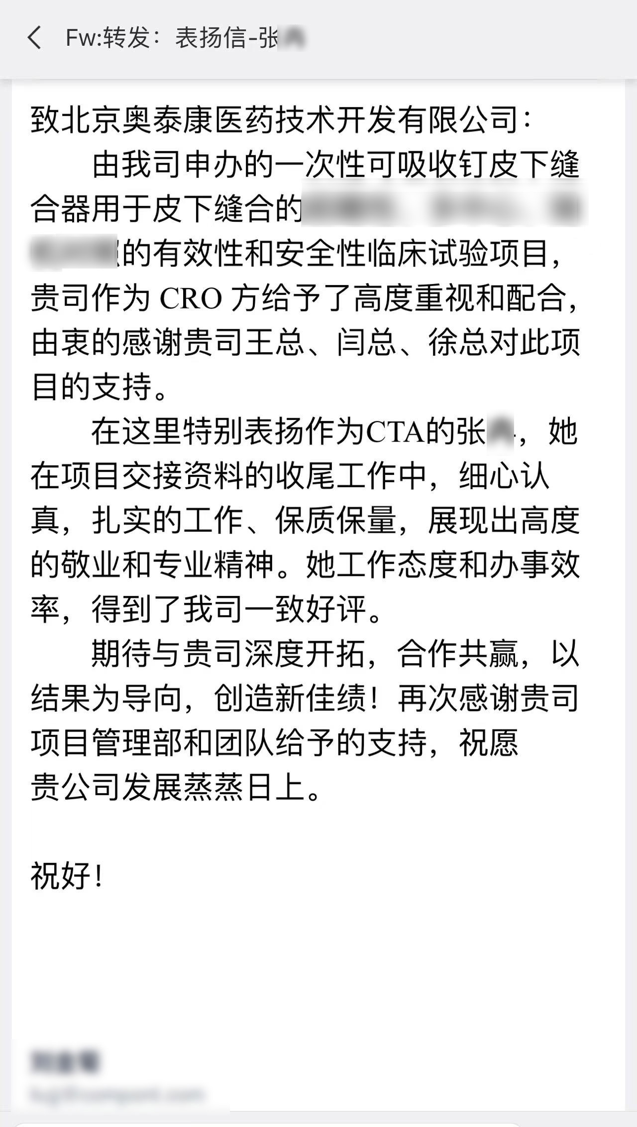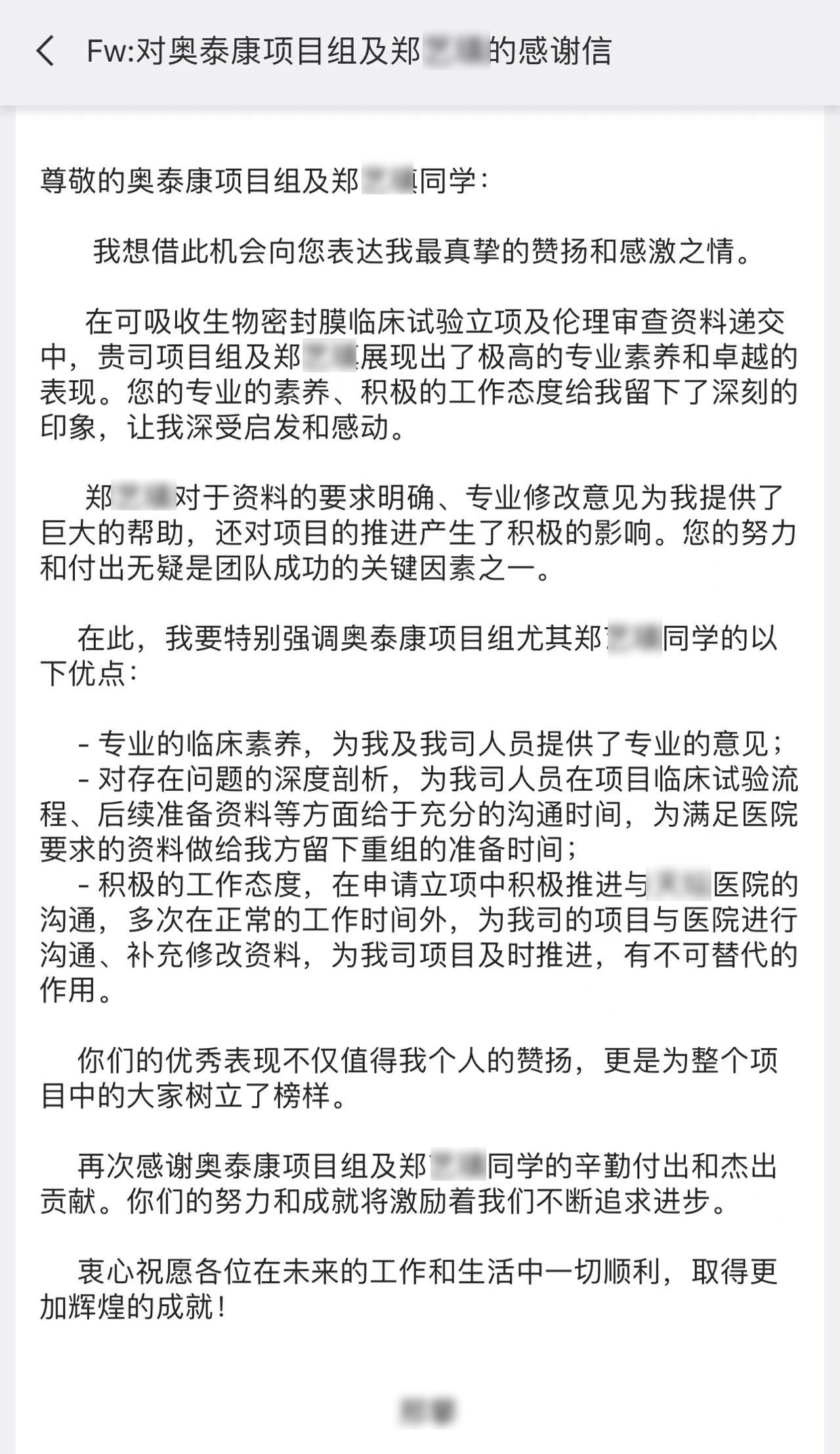 每一個項目的推進離不開臨床團隊的共同努力,一年過半,奧泰康陸續(xù)收到了多封來自合作伙伴的感謝信和表揚信,信中對奧泰康人在臨床試驗項目中的表現(xiàn)給予高度肯定。我們也對他們致以由衷的敬意,感謝他們?yōu)橥七M產(chǎn)品上市付出的不懈努力,讓我們共同查收這些信件吧~