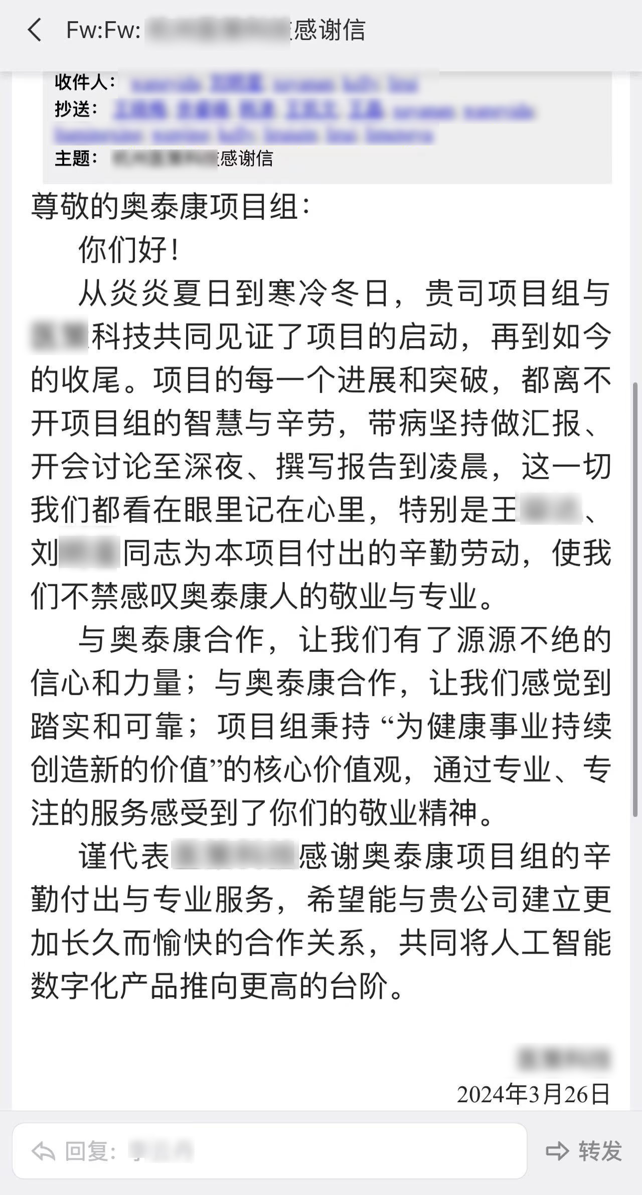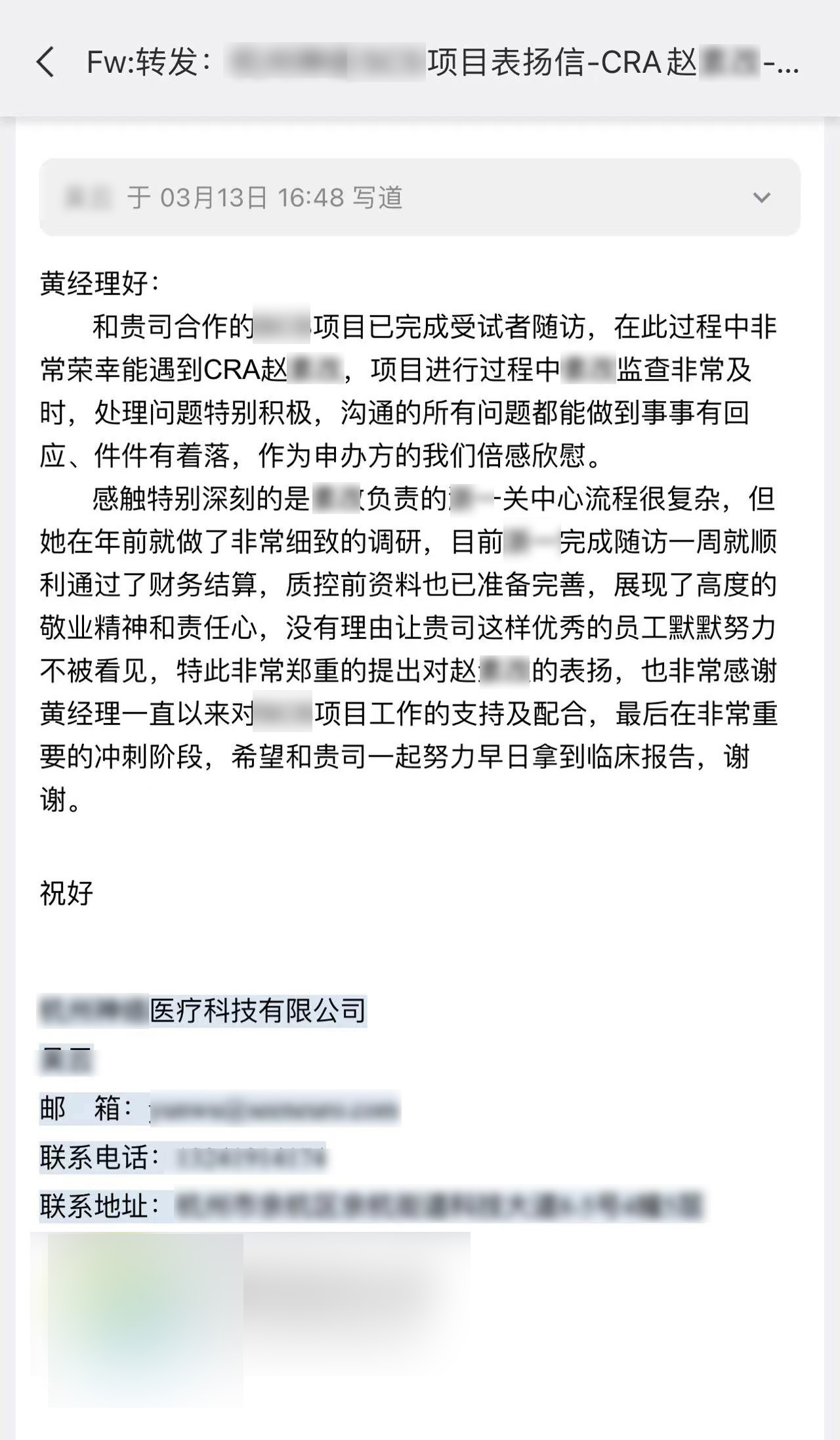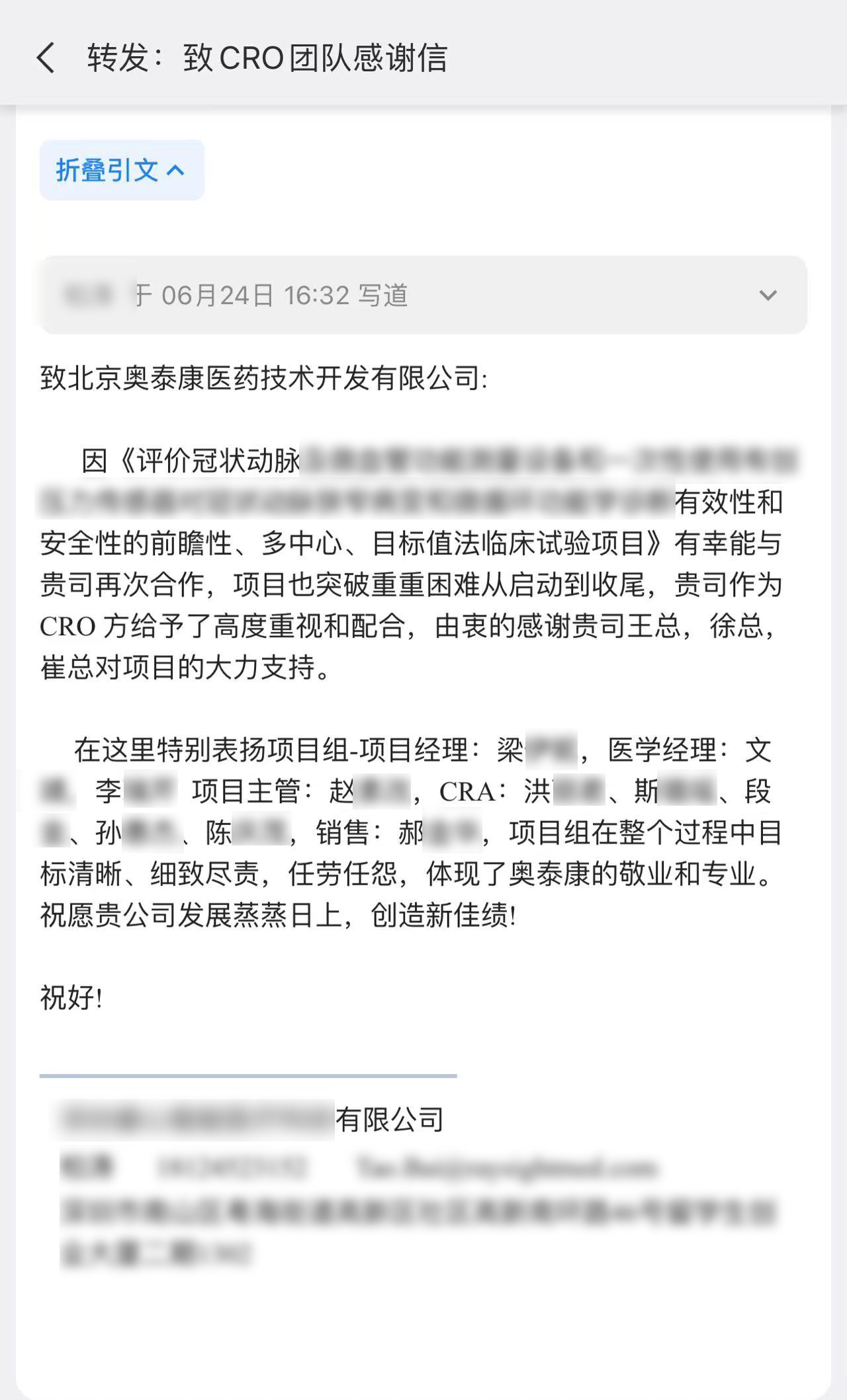 每一個項目的推進離不開臨床團隊的共同努力,一年過半,奧泰康陸續(xù)收到了多封來自合作伙伴的感謝信和表揚信,信中對奧泰康人在臨床試驗項目中的表現(xiàn)給予高度肯定。我們也對他們致以由衷的敬意,感謝他們?yōu)橥七M產(chǎn)品上市付出的不懈努力,讓我們共同查收這些信件吧~