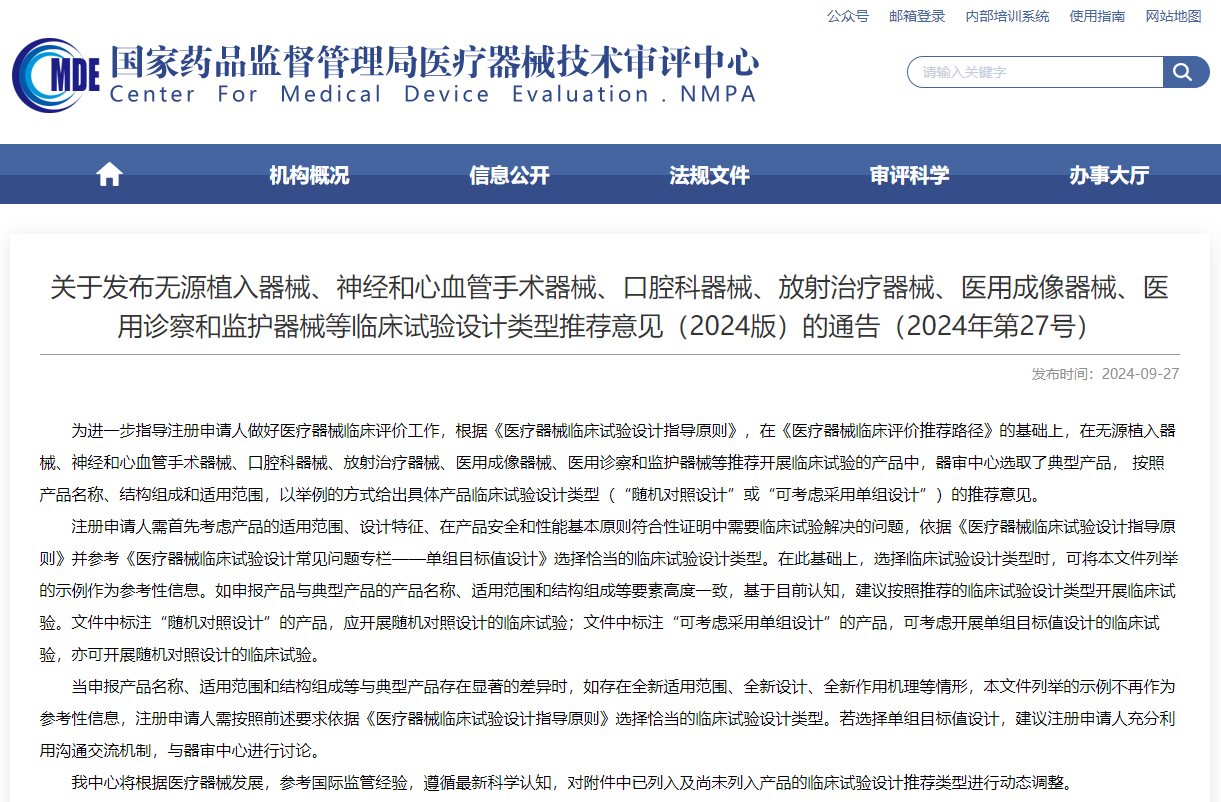 近日,器審中心發(fā)布《無源植入器械、神經(jīng)和心血管手術(shù)器械、口腔科器械、放射治療器械、醫(yī)用成像器械、醫(yī)用診察和監(jiān)護器械等臨床試驗設(shè)計類型推薦意見(2024版)的通告》。