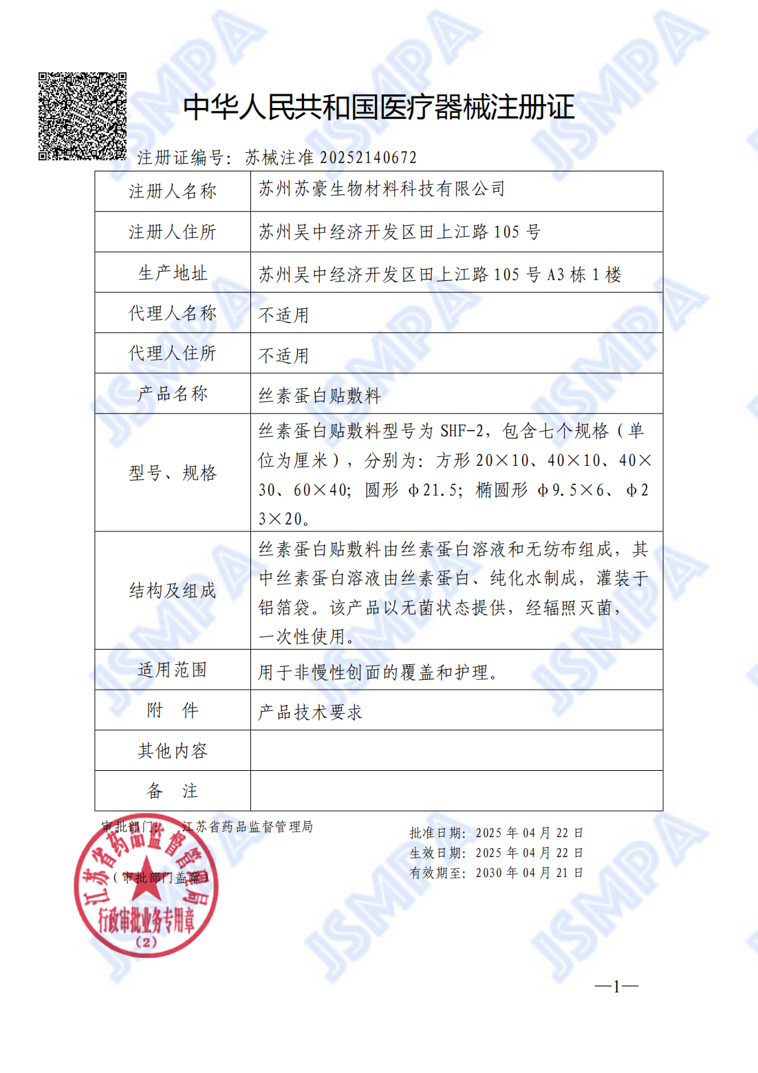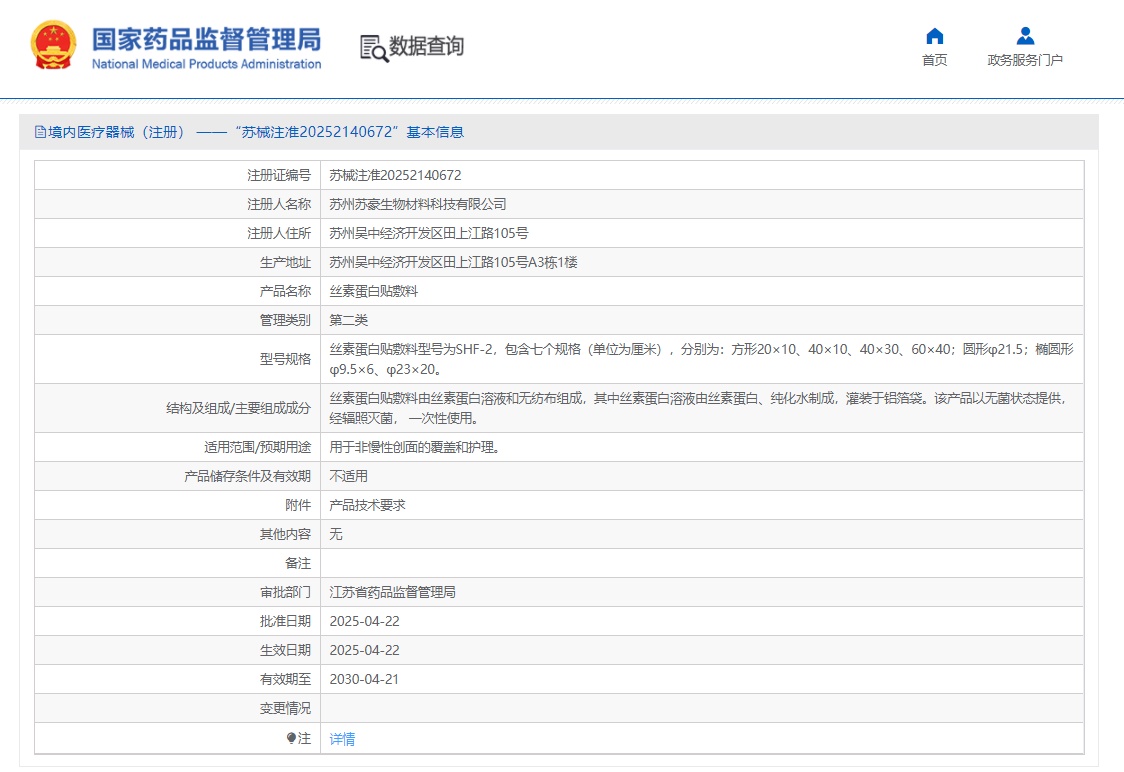 喜訊?????????奧泰康蘇州CDMO中心研發(fā)的「絲素蛋白貼敷料」獲國(guó)家藥監(jiān)局批準(zhǔn)上市2025年4月22日,經(jīng)國(guó)家藥品監(jiān)督管理局公示,奧泰康蘇州CDMO中心研發(fā)的絲素蛋白貼敷料(蘇械注準(zhǔn)20252140672)獲得NMPA批準(zhǔn)上市,產(chǎn)品獲批國(guó)家第二類醫(yī)療器械注冊(cè)證。