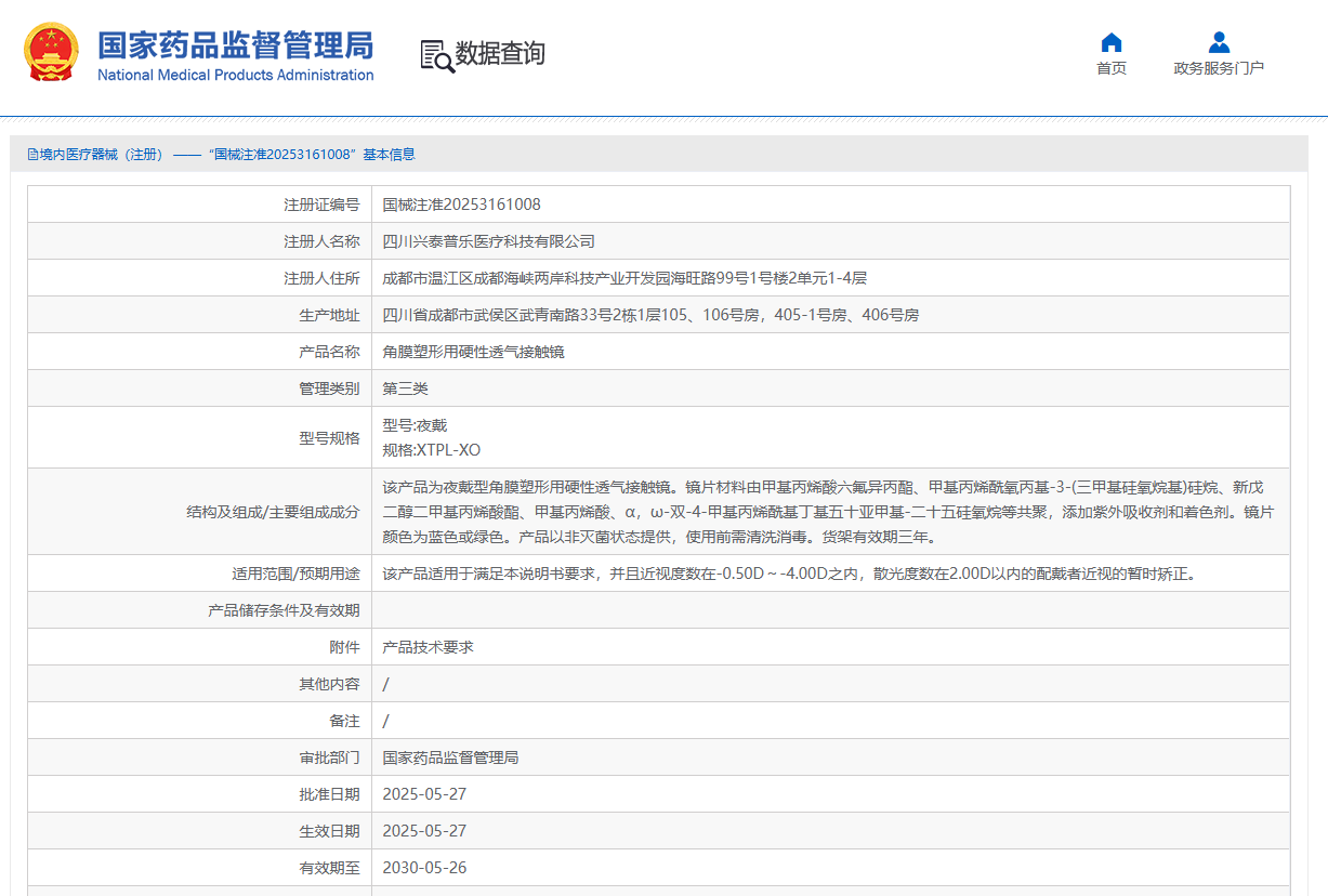 2025年5月27日,經(jīng)國(guó)家藥品監(jiān)督管理局公示,四川興泰普樂(lè)醫(yī)療科技有限公司的角膜塑形用硬性透氣接觸鏡(國(guó)械注準(zhǔn)20253161008)獲得NMPA批準(zhǔn)上市,奧泰康負(fù)責(zé)本項(xiàng)目臨床試驗(yàn)工作。