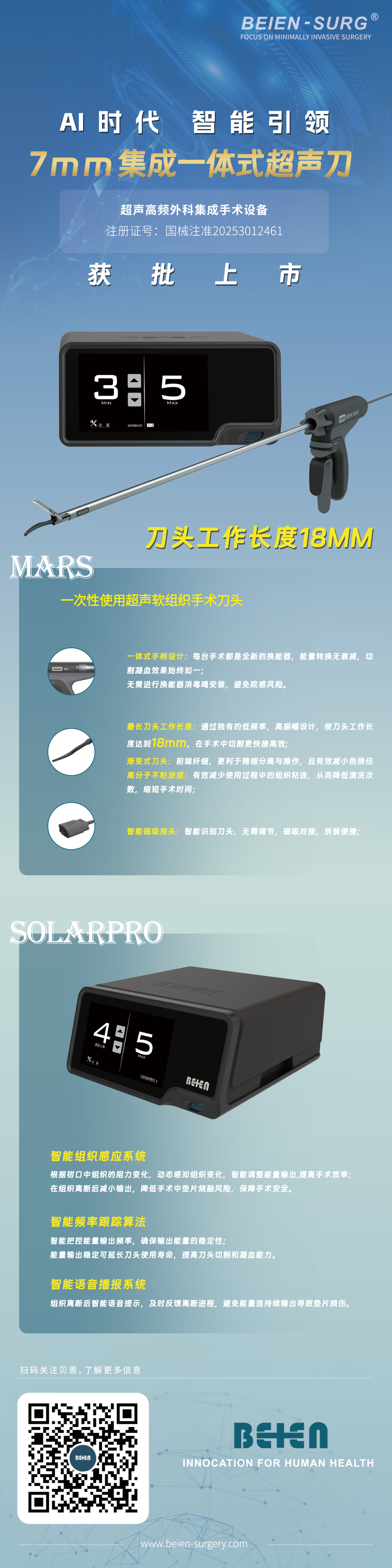 貝恩外科創(chuàng)新突破!全新7mm集成超聲刀正式獲批上市。SolarPro主機(jī)和Mars超聲刀頭在技術(shù)上進(jìn)行了全面升級(jí)。它搭載了新一代智能超聲能量控制系統(tǒng)與一體式集成技術(shù),實(shí)現(xiàn)了7毫米級(jí)血管的精準(zhǔn)閉合與超低熱損傷;獨(dú)有的低頻率、高振幅設(shè)計(jì),使刀頭有效工作長(zhǎng)度達(dá)到18mm,達(dá)到了能量外科領(lǐng)域的最高水平。此次獲批與上市,是貝恩外科在高端微創(chuàng)器械領(lǐng)域研發(fā)實(shí)力與產(chǎn)品創(chuàng)新能力的集中展現(xiàn),為公司的產(chǎn)品矩陣與市場(chǎng)發(fā)展注入了新的核心動(dòng)能。